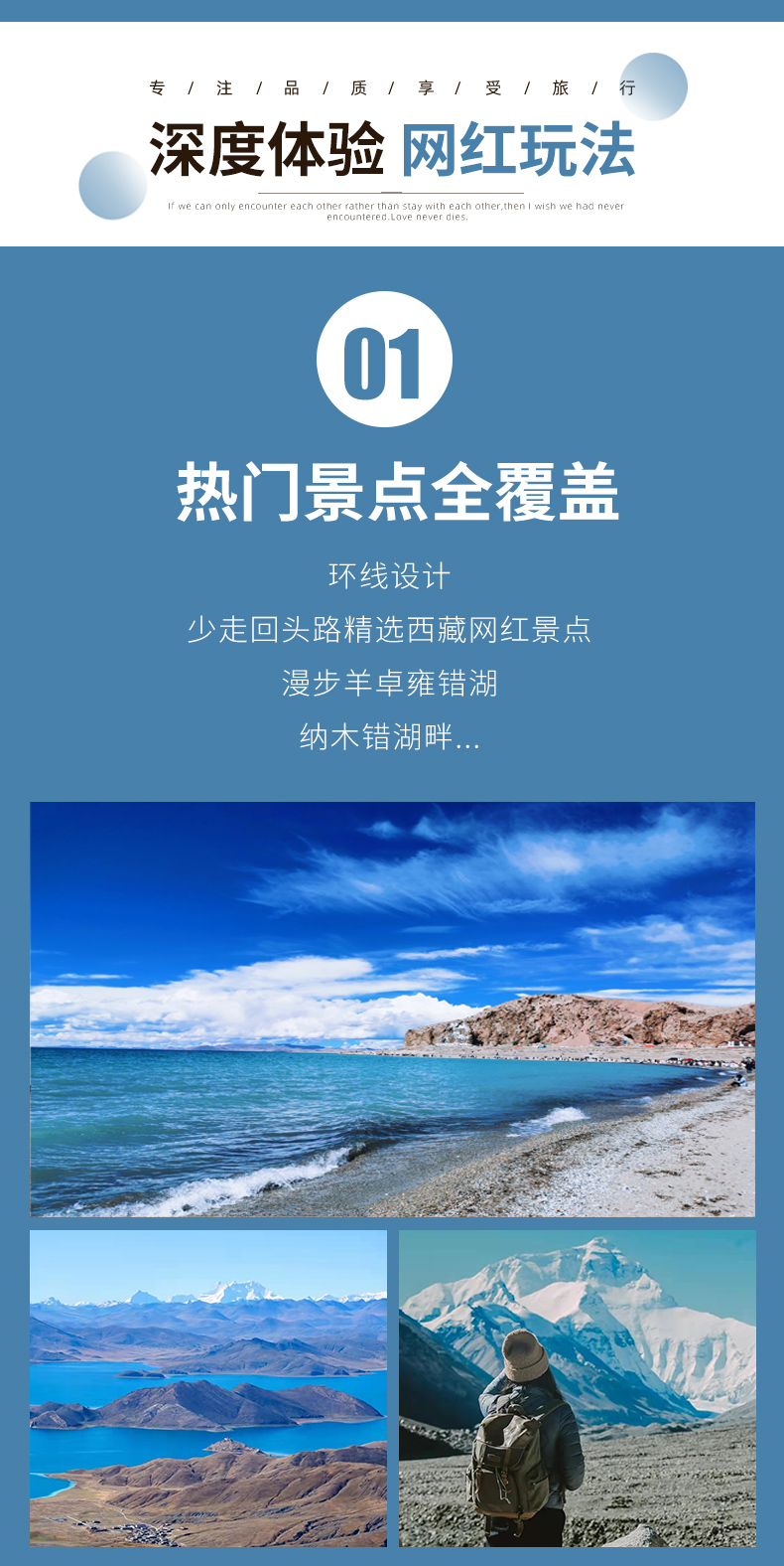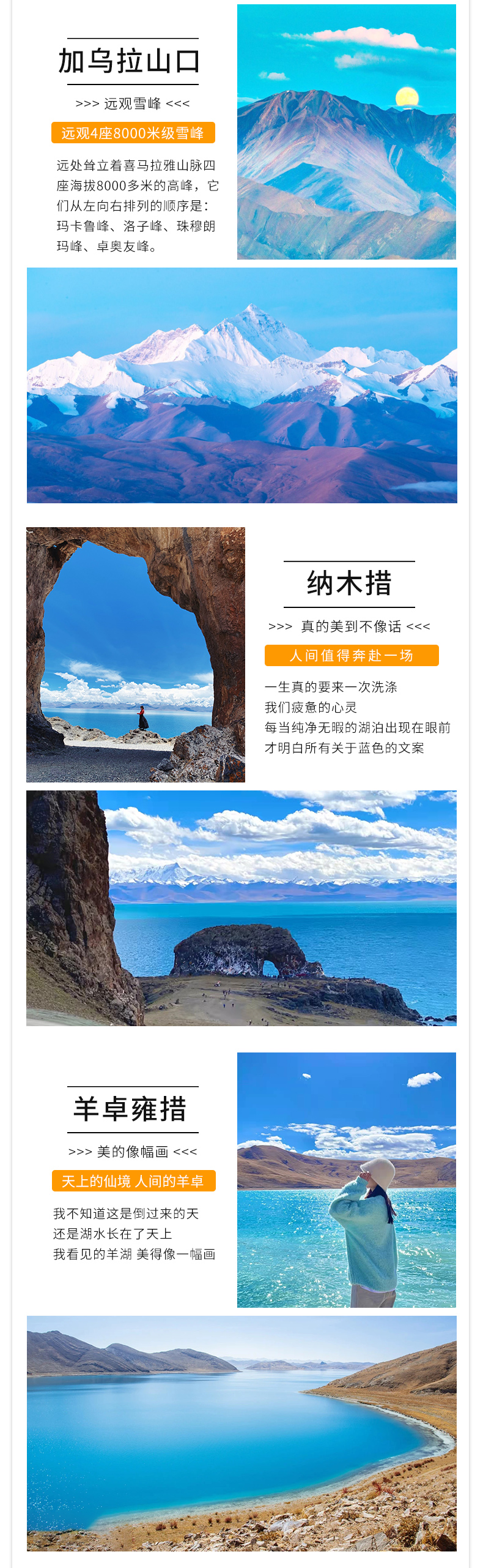 半环湖游览。羊湖蓝色毫无瑕 疵毫无杂色,似用最深邃的面孔与头顶的苍穹对视。 曾经这片壮美一直处于羊卓雍措蜿蜒的身 躯之下,待到她孑然自立,环着羊湖,您能感受到那一汪纯蓝,让人心旷神怡........